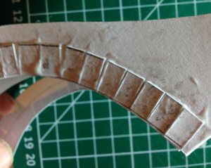 Mark lines 1cm up from the top and bottom and divide into 5mm sections, these will become tags to affix the arch bottom to the bridge arch.